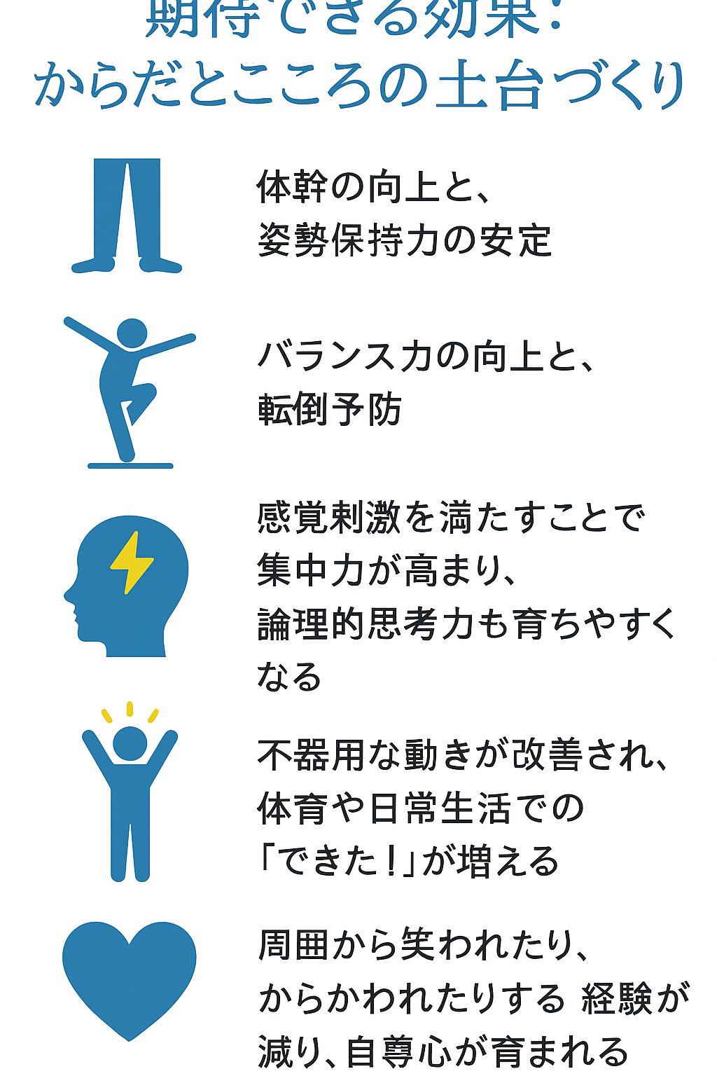• 不器用な動きが改善され、体育や日常生活での「できた!」が増える