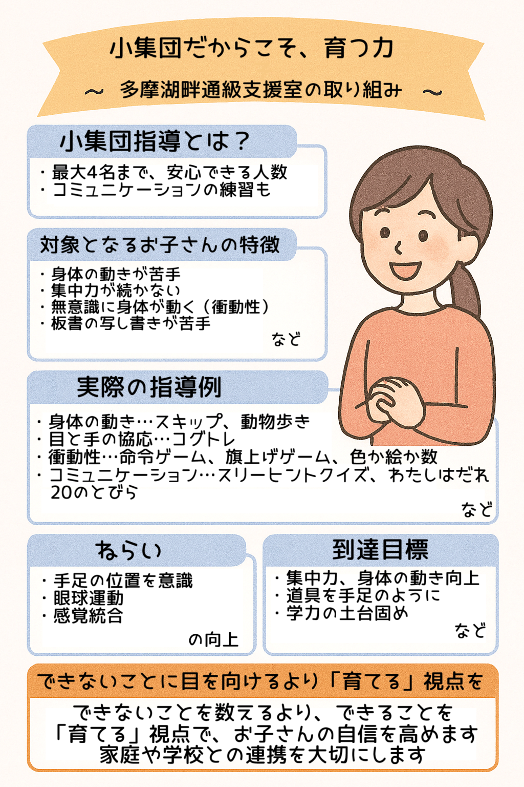 多摩湖畔通級支援室では、最大4名までの小集団指導を行っています。少人数だからこそ、一人ひとりの特性に寄り添いながら、仲間との関わりの中で「できること」を増やしていくことができます。少人数だからこそ、子どもたちの安心感を保証し、友情を育むことができると考えます。